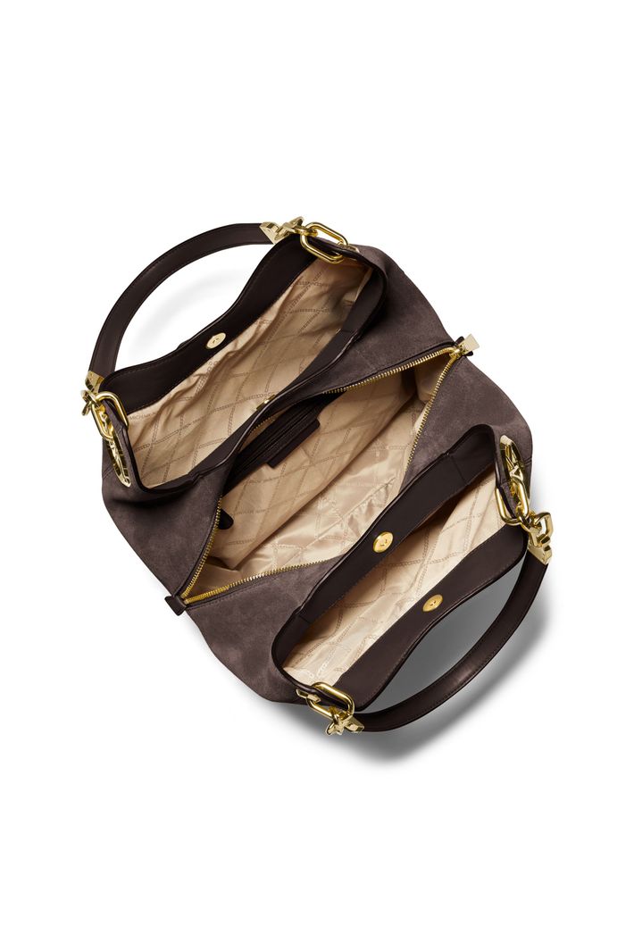 Nossa bolsa tote Lillie combina glamour atemporal com funcionalidade cotidiana. Projetada em um formato descontraído e detalhada com nosso hardware exclusivo, esta bolsa apresenta um exterior de camurça suave que se abre para revelar dois compartimentos de encaixe e um bolso central seguro com zíper. Conte com ele para carregar seus itens essenciais com facilidade e estilo.