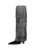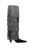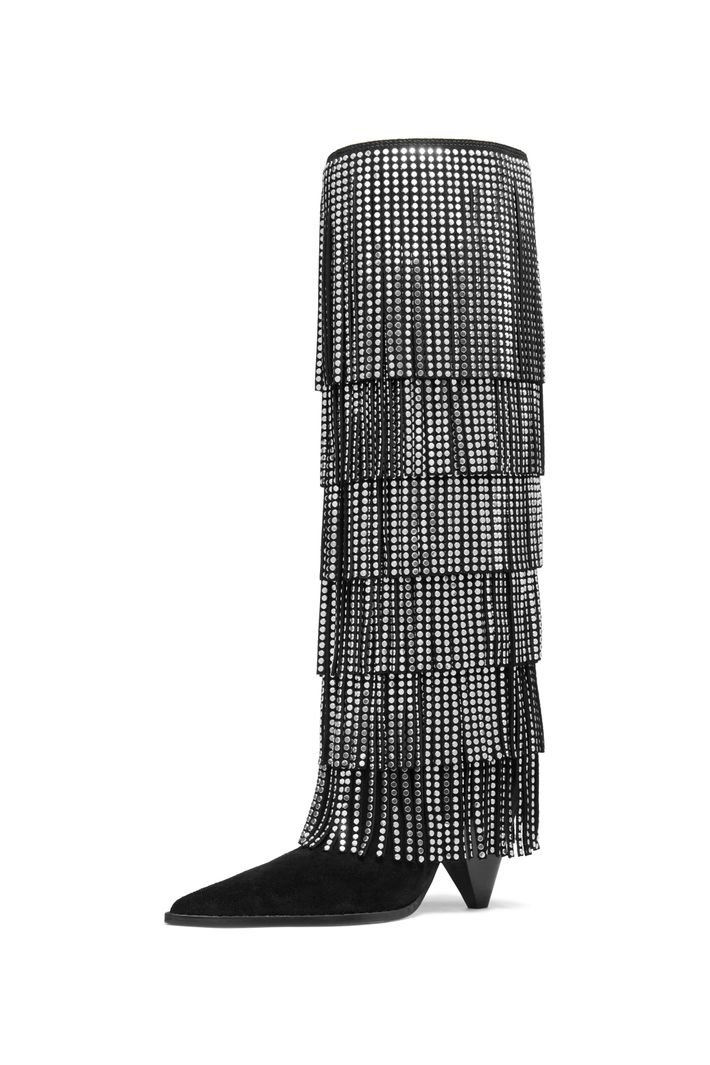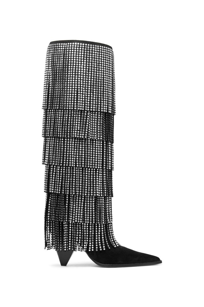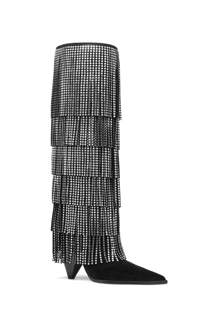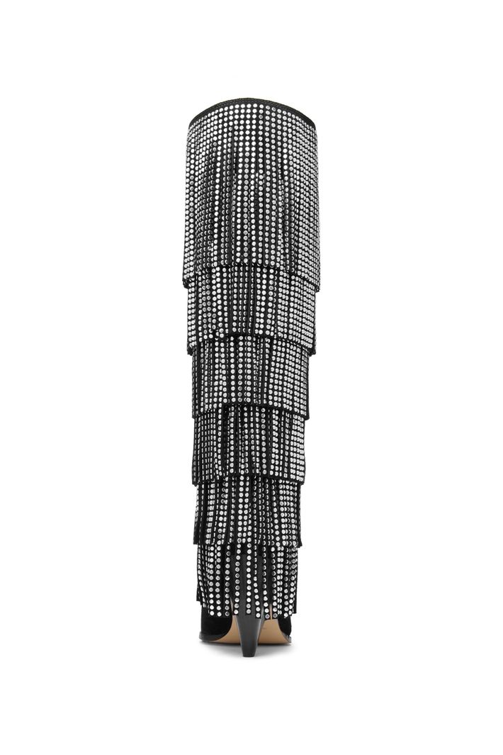 Com franjas em camadas e aplicação de studs, a bota Jayla em camurça cria um efeito de movimento sofisticado e cheio de personalidade. O design de cano alto com bico fino alonga a silhueta, enquanto o salto médio garante elegância e conforto. Uma peça statement que transforma produções minimalistas perfeita para brilhar ao lado do seu little black dress favorito.