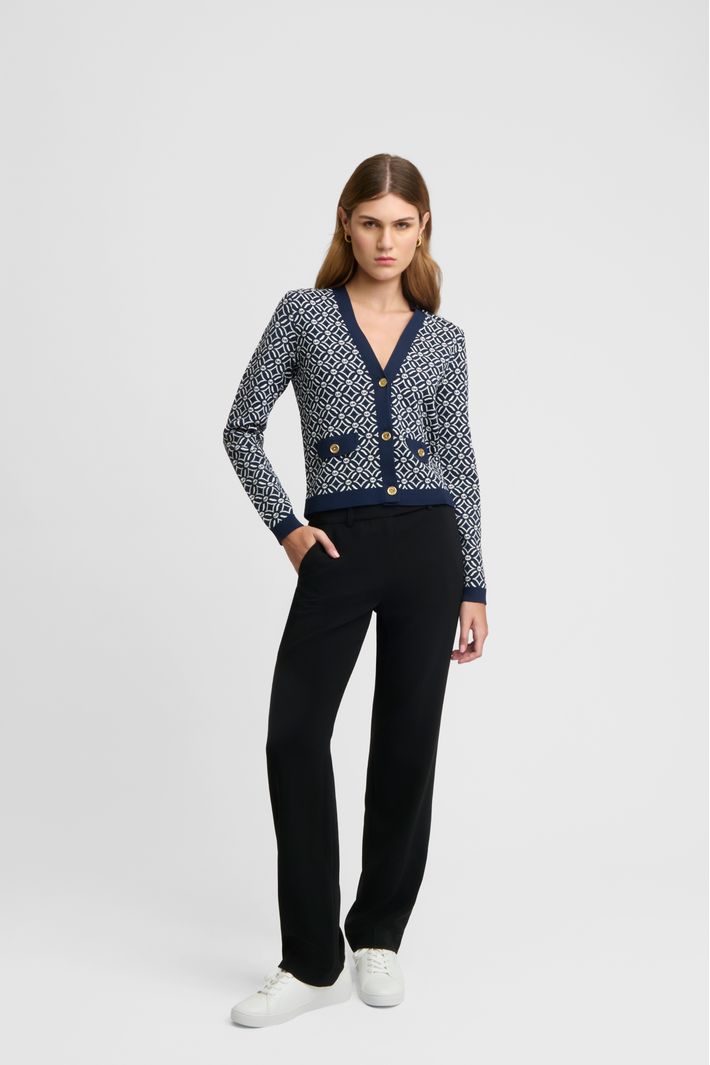 • Confeccionado de uma mistura de algodão e viscose e com detahes de botões de alto brilho gravados com as iniciais da marca. Destaque o decote V com um colar de corrente.