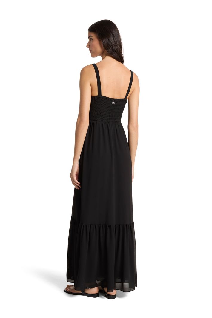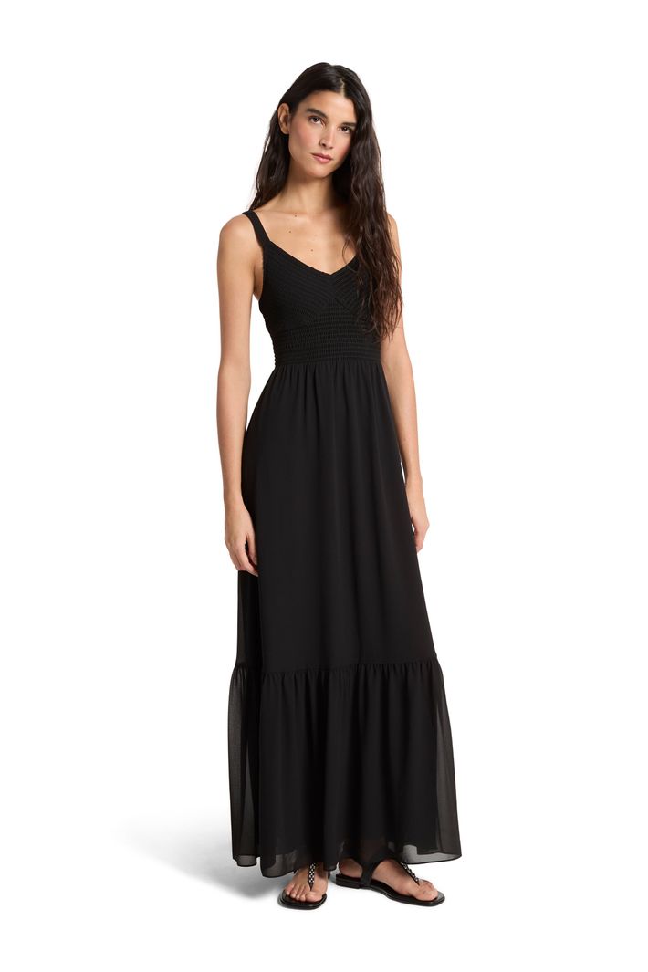 Feminino e delicado, este vestido longo combina leveza e elegância em cada detalhe. O corpete franzido valoriza o busto e proporciona um ajuste confortável ao corpo, enquanto a gola V alonga a silhueta com sutileza. As alças de ombro trazem equilíbrio ao design, criando um visual refinado e versátil.