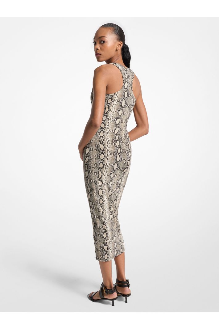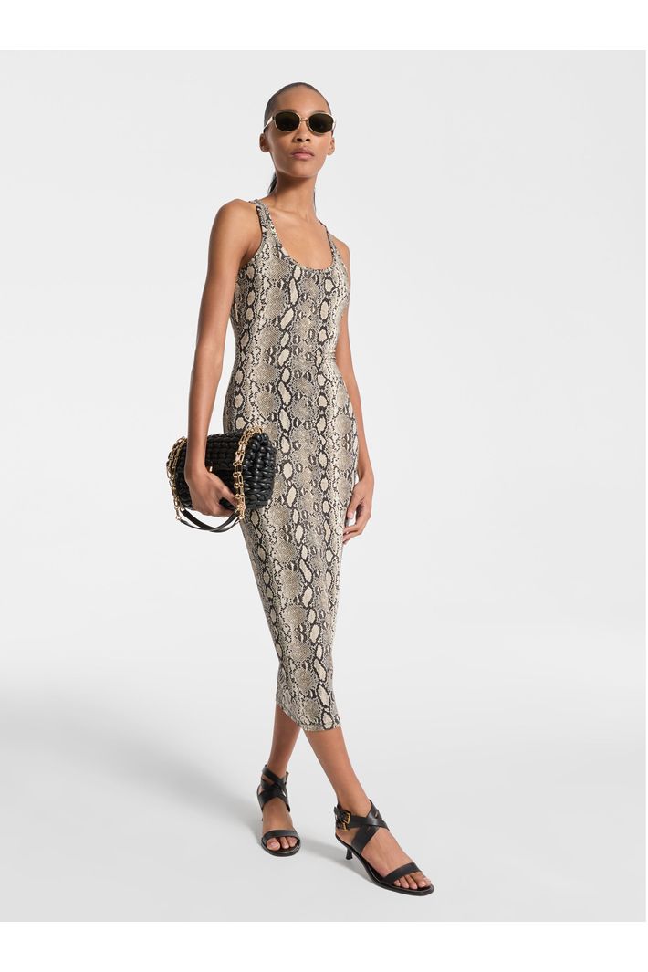 O clima quente pede este vestido regata. Confeccionado em malha parcialmente reciclada, possui silhueta ajustada ao corpo e estampa de cobra super atual, em uma paleta versátil. Combine com sandálias de couro e uma bolsa estruturada para um look completo.